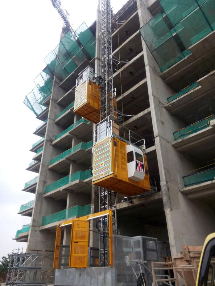 該工程項目采用我公司生產(chǎn)的三種型號施工升降機:1、SC200/200E施工升降機;2、SC200/200GBG變頻高速施工升降機,運行速度為0~60m/min;3、SC200/200GBZ變頻中速施工升降機,運行速度為0~46m